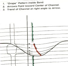 When drape occurs in the channel, the dips point at right angles to the strike. These relatively low angle dips, when observable, are due to channel cutting, and arise from the channel base changing in a series of progressively shallower concave surfaces as infilling proceeds.