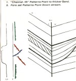 Bars and channels can be mistaken for each other on logs and cross sections. In the case of a stream channel, the cross section of the sand deposit has it's greatest width at the top and a base that is convex downward. The sand bar has a cross section that is widest at the base, relatively flat at the bottom, and a top that is convex upward. Dipmeter data will usually resolve the two cases. The channel may have drape within the sand body; the bar may have drape above the sand body.