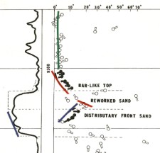 Distributary mouth bar sands are relatively fine grained and moderately sorted. However, curve shapes reflect a general coarsening upward in a highly serrated funnel type configuration. The serrations arise from thin shale layers laid down in times of low water flow.