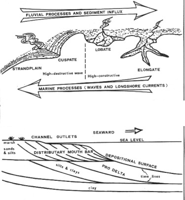A cross section of a pro-grading delta front in a highly constructive situation is shown in the bottom half of the above illustration. This shows the relative positions and the lithologies of delta front deposits. A highly constructive delta is most favorable to the formation of distributary mouth bars or delta bar fingers. These are sands and silts dropped in front of the mouths of distributary channels which suffer little or no reworking by wave motion. The river currents are the principal factor in determining sand body geometry. Sand bodies usually take the form of elongate or lobate masses extending outward from the river mouth.