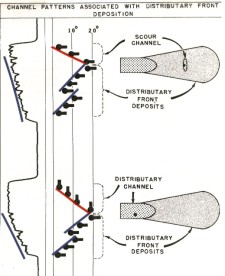 Water flow during deposition is highly turbulent, resulting in trough or festoon type current bedding. Dipmeter results are erratic in both dip angle and direction because of non-planar bedding surfaces and incomplete depositional sequences. Dip angle varies between zero and 35 degrees while direction may vary up to 180 degrees, but usually remains within a 90 degree arc, which reflects downstream direction and the direction of elongation of the sand body. Planarity rating of dip results are low. GEODIP and SYNDIP presentation assist in recognizing the non-planar beds.