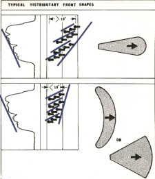 Distributary fronts vary in shape and size due to differences in transport speed and volume, and the interference of the ocean. Long narrow fronts, as may be found in a bird's foot delta, have a relatively high spread in the dip angles of the foreset beds, usually greater than 10 degrees. More compact or fan shaped fronts have dips in their foreset beds of less than 10 degrees.