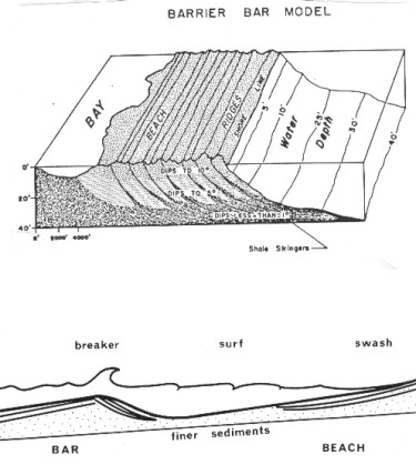 With an adequate supply of sediment, a bar becomes emergent, forming a barrier. Barrier bars have gentle dips on both sides and are often associated with coal swamps or evaporitic lagoons on the landward side. The barrier bar is formed by regression of the shoreline, and contains three fundamental units: