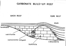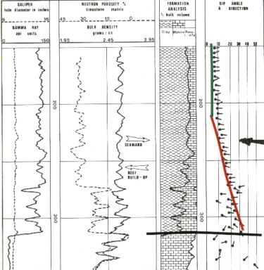 The seaward or fore reef edge of a reef is normally quite steep and may form a talus slope of reef detritus at its base. Cross-bedding dips pointing away from the immediate reef high can be measured in this detrital wedge. The back reef, or quiet lagoonal side of the reef, is made up of very fine grained material, interbedded with calcareous mud and may show relatively flat beds or no bedding at all on the dipmeter.